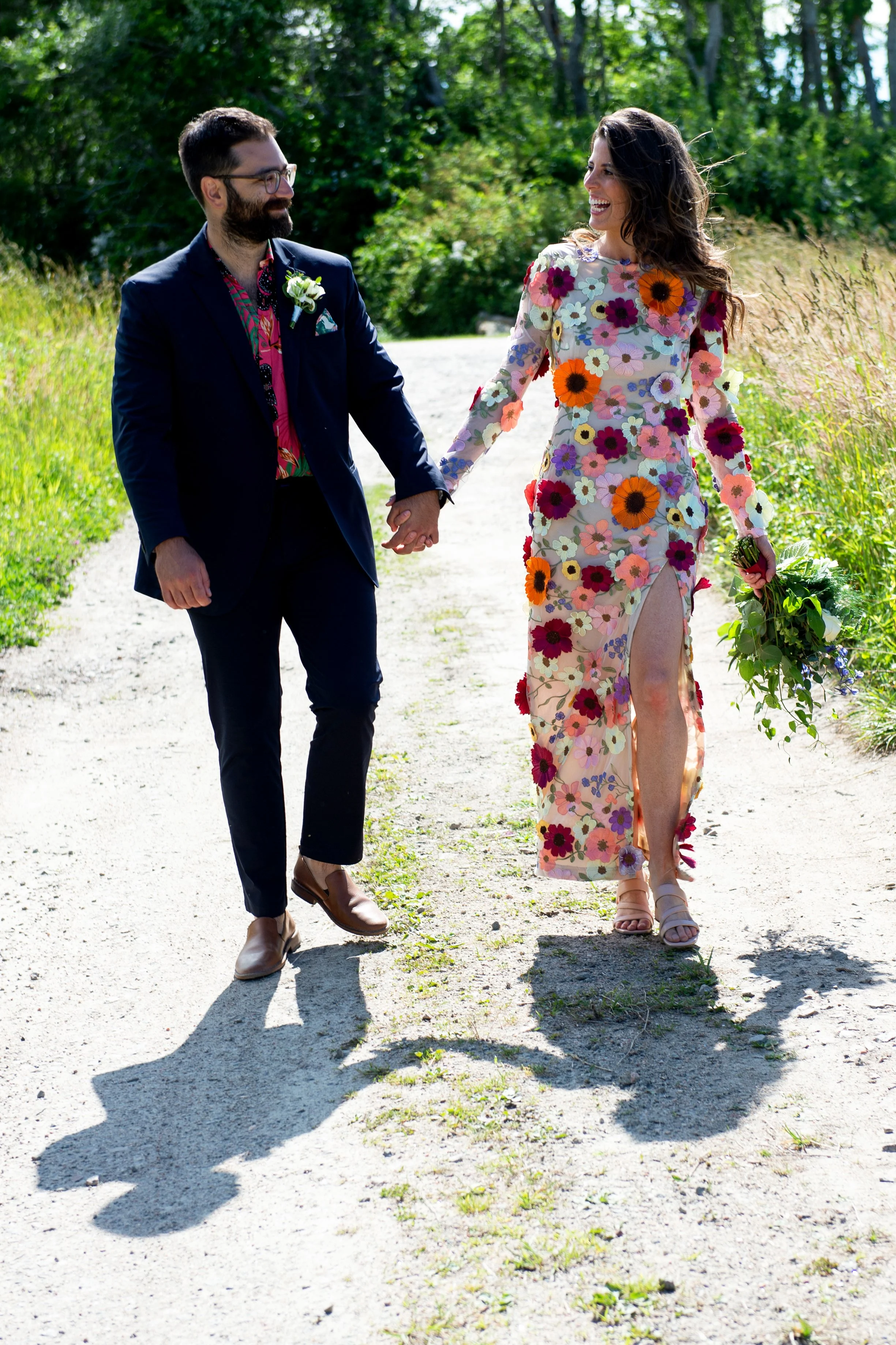 Jill and George’s ceremony was held on a scenic overlook in a neighbor’s backyard. The dress code was “Colorful, Flamboyant, Be Somebody” which made for a great mix of color and unique accessories. Guests gathered around a large rock that the couple and their officiant stood on; the ocean and the cloudless blue sky as their backdrop. Guests tossed dried flower petals as the couple recessed and then walked or drove back up the road to Jillian’s family home for the reception.